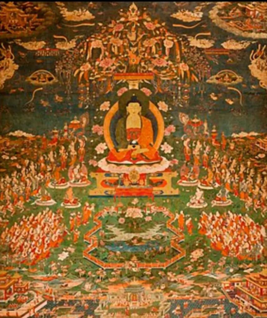 大覺世尊初成道時,諸佛現十方,慰谕釋尊,更遺諸大菩薩。般若經時,釋尊長舌蔽三千,千佛現十方。金光明經有:四方四佛現。阿彌陀經有:六方諸佛,舌蔽三千。大集經有:十方諸佛、菩薩集大寶坊。此等儀式與法華經對照觀之,法華殊勝,是黃石與黃金,白雲與白山、白冰與銀鏡,黑色與青色之比;然,翳眼者,眇目者,一眼者,邪眼者不能辨之。華嚴經無先後之經,自無佛語相違之理,何招來大疑。大集經、大品經、金光明經、阿彌陀經等,爲彈呵诸小乘經之二乘, 說十方淨土,令凡夫菩薩欣慕,厭煩二乘。