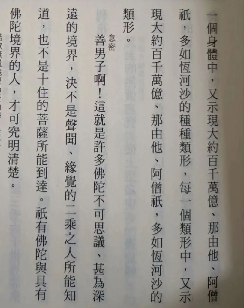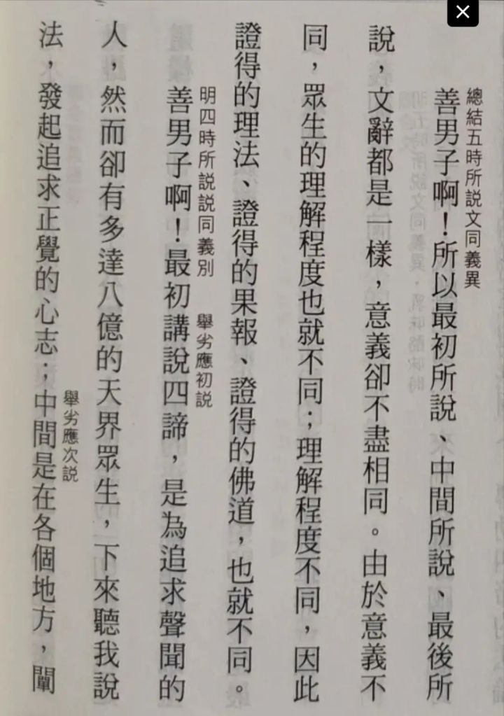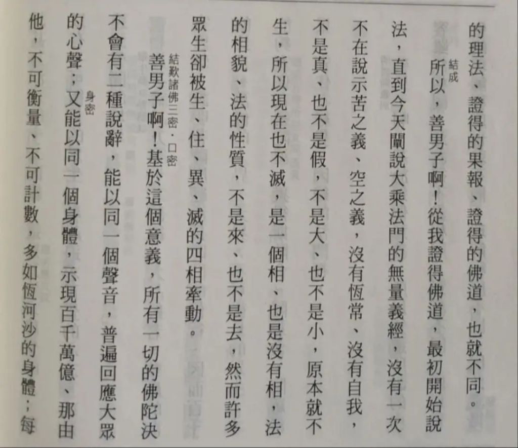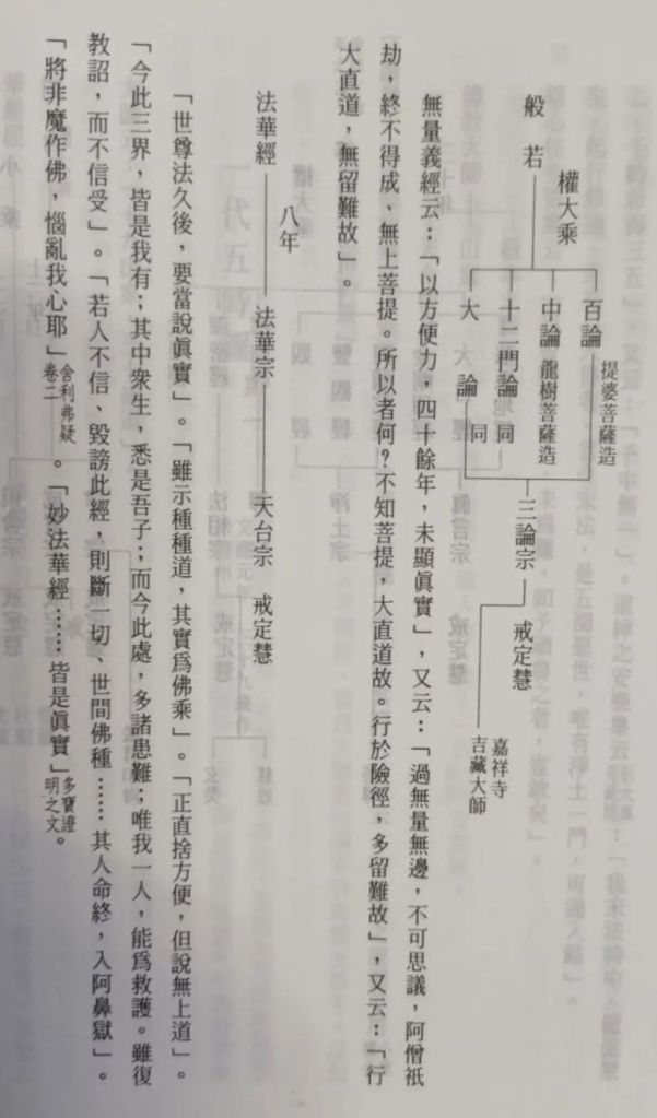 此等不足言也。驚人耳目者,乃於無量義經,舉述華嚴經之唯心法界,方等、般若經之海印三味,混同無二等大法,或說是「未顯眞實」,或說是「歷劫修行」,如此施予破折之經亦說:「我先道場,菩提樹下,端坐六年,得成阿耨多羅三藐三菩提」,與初成道華嚴經「始成」之文如出一 辙。此不免啓人疑惑之處,乃此既是法華經序分,不能觸及正宗分之法門故也。但何以既至法華經正宗分,說略開三、廣開三之時,旣說:「唯佛與佛,乃能究盡,諸法實相」等,又說:「世尊法久後」等,及「正直捨方便」等,而多寶佛亦指迹門八品,證明「皆是眞實」,還有何事可隱蔽?