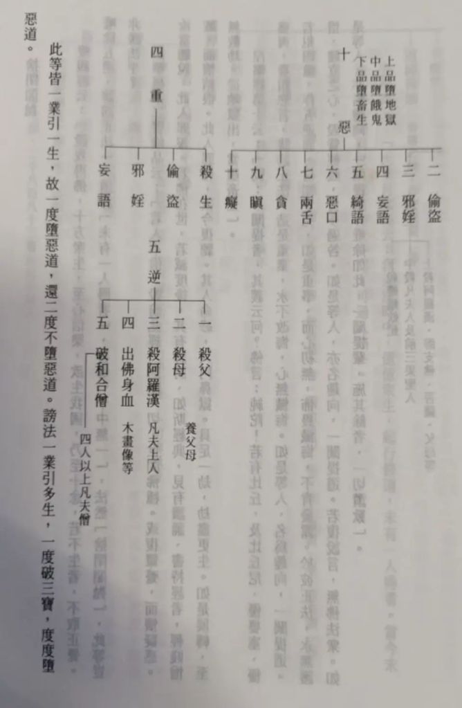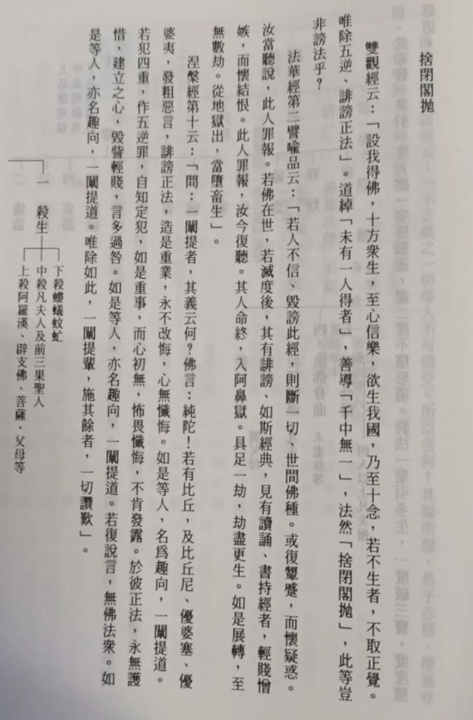 又有順次生必堕地獄者,自造重罪,而無現罰,一個提人是也。涅槃經云:「迦葉菩薩白佛言:世尊!如佛所說,大涅槃光,入於一切,衆生毛孔」,又云:「迦葉菩薩白佛言:世尊!云何未發菩提心者,得菩提因」。佛答此問云:「佛告迦葉:若有聞是,大涅槃經,言我不用,發菩提心,誹謗正法。是人即時,於夜夢中,見羅剎像,心中怖畏。羅剎語言:咄,善男子!汝今若不發菩提心,當斷汝命。是人惶怖,寤已即發、菩提之心。當知是人,是大菩薩」。非甚大惡人者,若誹謗正法即時當夢見,而心生改悔。又云:「枯木石山」等,又云:「焦種雖遇甘雨」等,又云: 「明珠淤泥」等,又云:「如人手創,捉毒藥」等,又云:「大雨不住空」等。如此多譬,所詮, 若是上品之一闡提人,以順次生,必墮無間,故無現罰。例夏桀。殷紂之世,天無災變,以有重 科,世必滅亡故也。
